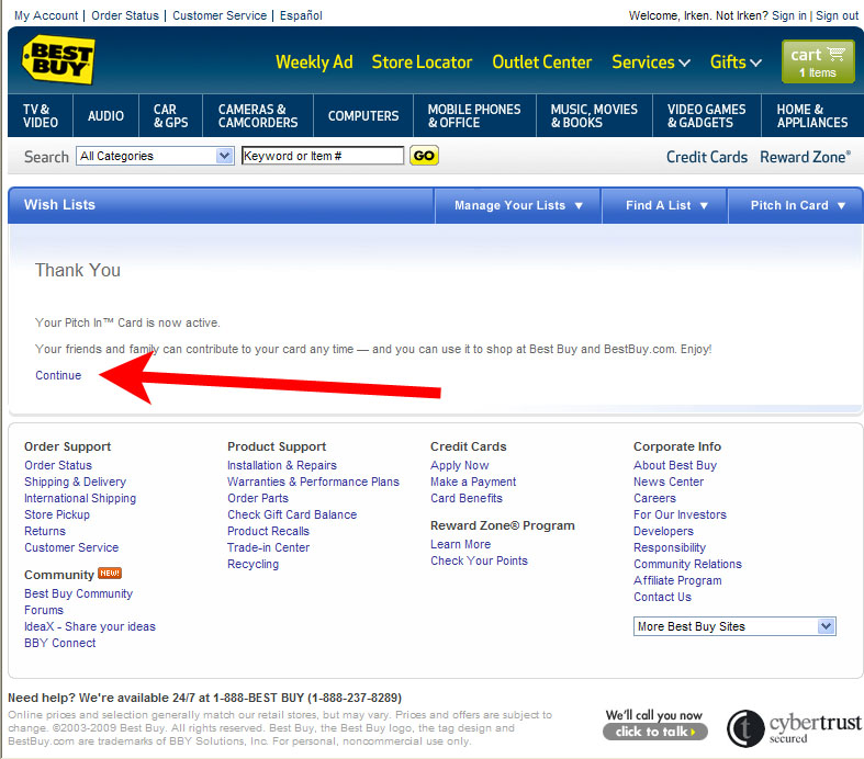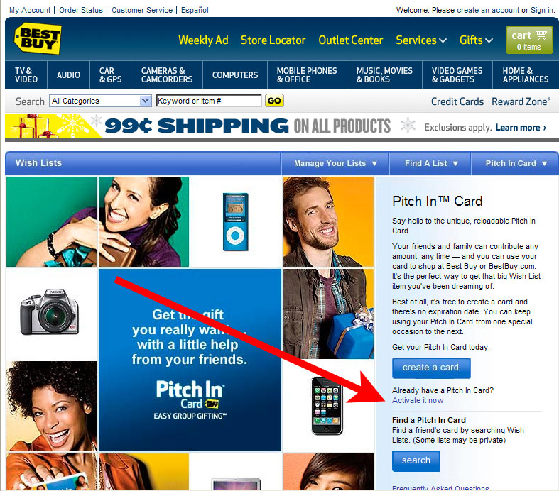 | Go back to the BestBuy website, http://www.bestbuy.com and click on Gifts then select the Pitch In Card choice. | ![]() |