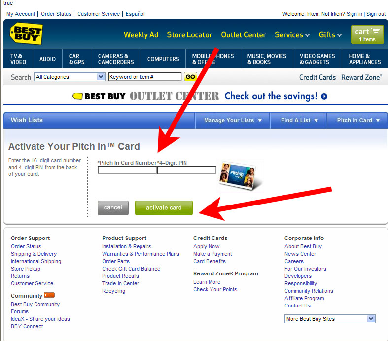 | Hi Fiancee! Here are the remaining instructions once you either receive your Pitch In card in the mail or picked one up at a BestBuy Store. If you haven't already checked the balances on your BestBuy Gift Cards (you will need this information), I have a little webpage to help you determine the balances. | |