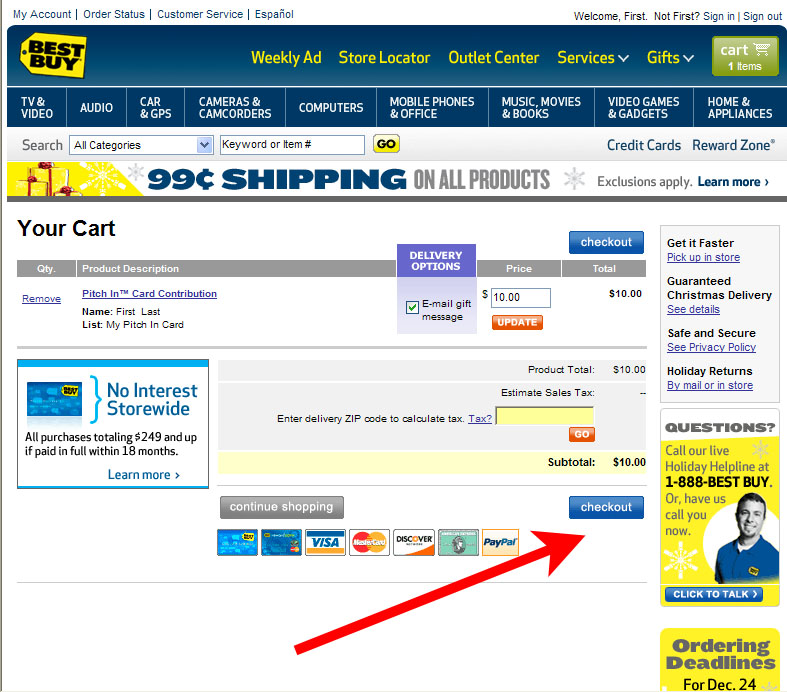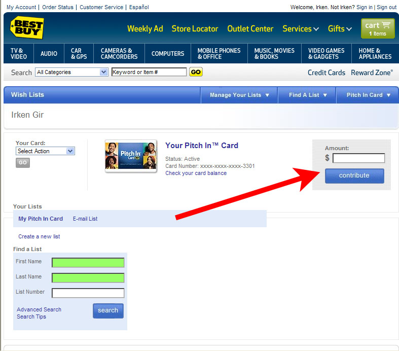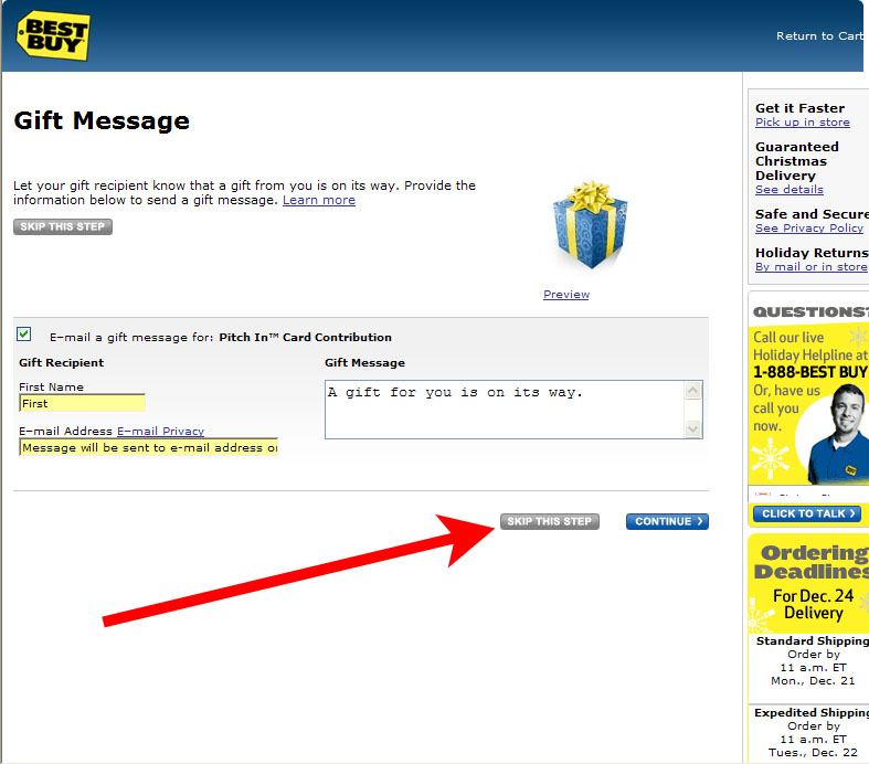 | Go back to the BestBuy website, http://www.bestbuy.com and click on Gifts then select the Pitch In Card choice. | ![]() |